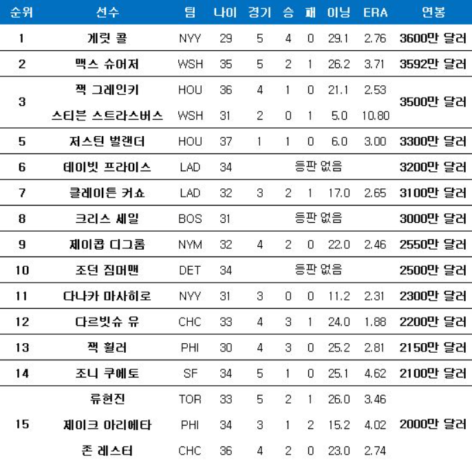 메이저리그 연봉 순위에서는 류현진 선수는 2000만 달러로 공동 15위에 위치해 있습니다. 선발 맞대결을 펼쳤던 게릿 콜이 1위, 워싱턴 내셔널스의 맥스 슈어저 3592만 달러로 2위를 차지하고 있습니다.