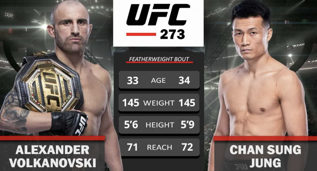 정찬성 볼카노프스키 경기가 한국시간으로 오는 4월 10일 일요일 미국 잭슨빌에서 열릴 예정입니다. UFC 페더급 챔피언 알렉산더 볼카노프스키와 랭킹 4위 ‘코리안 좀비’ 정찬성과 챔피언 벨트를 걸고 뜨거운 한 판 승부를 펼칠 예정입니다.